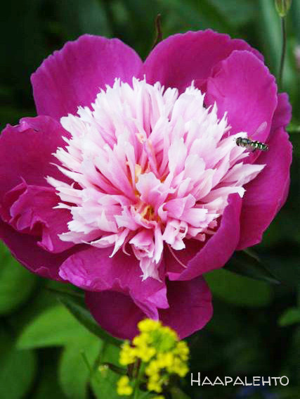 Pihahietikon yli, talon päätyyn ja lammen reunalle. Pioni 'Do Tell' on avannut ensimmäisen ja ainoan kukkansa. Oi joi! Olisi näitä enemmänkin voinut ihailla.